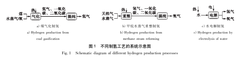熱化學(xué)工藝通常需要高熱,例如:煤氣化制氫的氣化溫度,對(duì)于濕法料漿氣化技術(shù)為1 250~1 400℃,干法粉煤氣化技術(shù)為1 400~1 700℃;甲烷水蒸氣重整制氫, 重整反應(yīng)的溫度通常為750~920℃;甲烷芳烴構(gòu)化技術(shù)目前還處于研究階段。煤氣化制氫和甲烷水蒸氣重整制氫都會(huì)產(chǎn)生溫室氣體———二氧化碳,通常稱為灰氫, 見圖1-a)~b)。這類制氫工藝與碳捕集結(jié)合起來產(chǎn)生的氫氣,通常稱為藍(lán)氫。