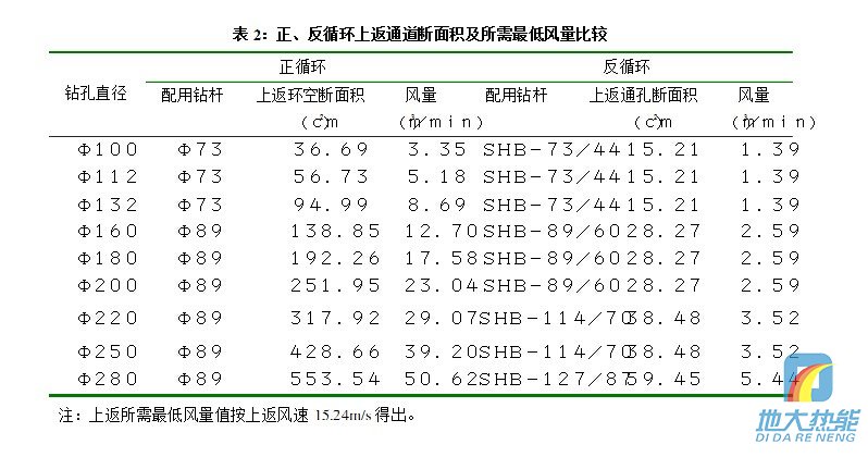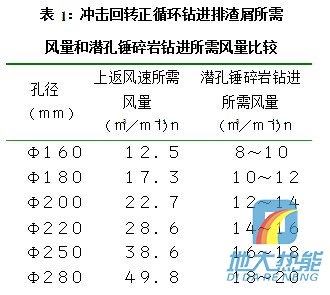 基巖水井通常口徑為Φ160~Φ280mm之間,該口徑硬巖的鉆進(jìn)效率低,成本高,施工周期長,成為鉆探界亟待解決的難題。20世紀(jì)70年代開始,我國已引進(jìn)潛孔錘技術(shù)應(yīng)用于水井鉆鑿,鉆進(jìn)效率數(shù)倍提高,展示了潛孔錘鉆進(jìn)的良好前景。但水井工程,孔深大,背壓高,配套使用的空壓機(jī)不但風(fēng)量要求大,風(fēng)太也高,使鉆進(jìn)成本大幅度增高。主要矛盾是滿足排渣屑上返風(fēng)速的要求時,供風(fēng)量巨大,遠(yuǎn)超過了潛孔錘本身工作的需求。計算不同孔徑條件下滿足上返風(fēng)速15m/s供風(fēng)量的需求,見表1(Φ89鉆桿為例)。表1數(shù)據(jù)表明,孔徑越大,為滿足排渣屑要求而消耗的能量越大,經(jīng)濟(jì)性越差。若實施反循環(huán)鉆井技術(shù)工藝,則排渣屑所需風(fēng)量大大減小,如表2所示。
